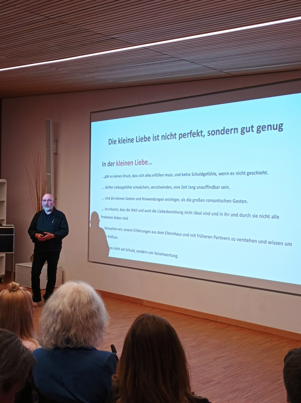 Der Referent räumte mit idealisierten Vorstellungen von der „großen Liebe“ auf. Sie führe oft zu einem Supermarktverhalten: Wenn sie nicht mehr passt, wird sie ausgetauscht. Stattdessen plädiert er für „resignative Reife“ – die Fähigkeit, auch das Unvollkommene zu lieben. Oder wie Holzberg es formuliert: „Die kleine Liebe ist nicht perfekt, sondern gut genug.“