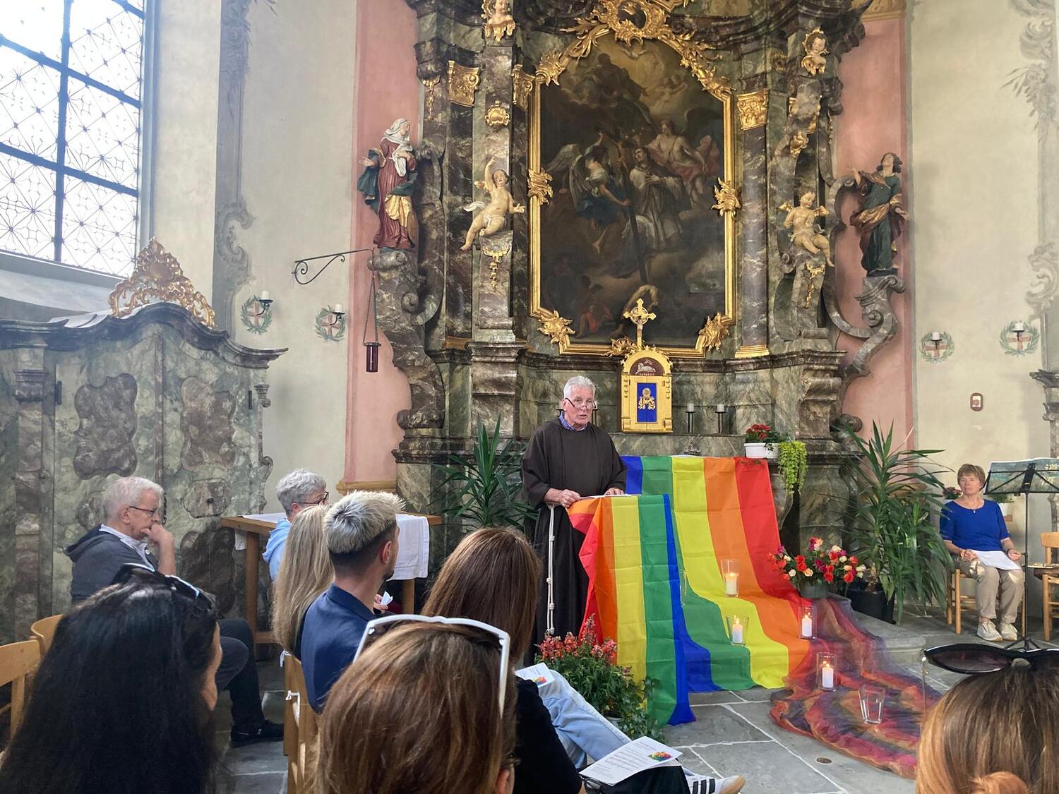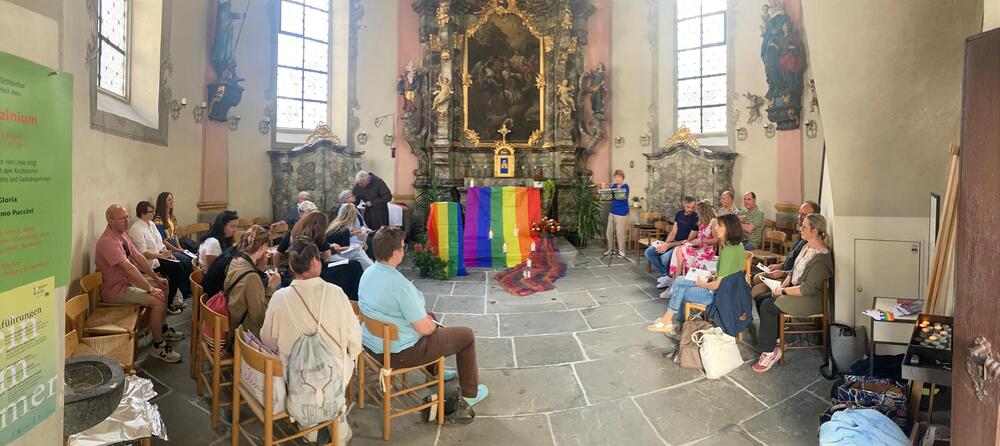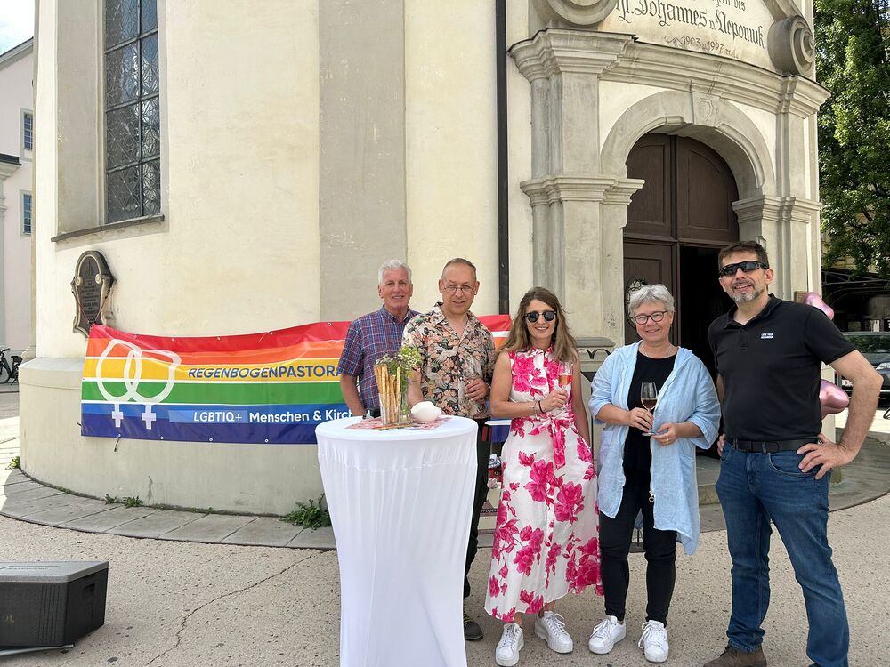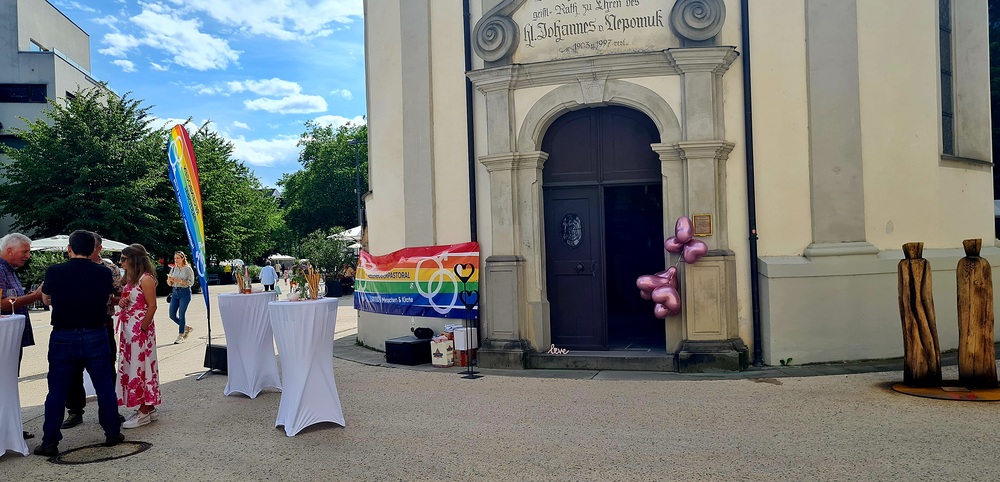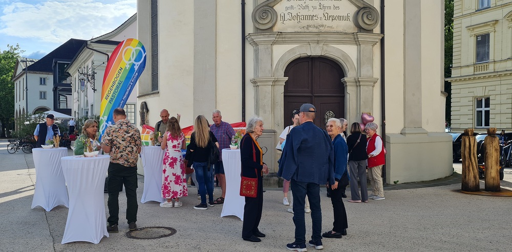 Bereits vor Beginn der Feier öffnete sich der Vorplatz der Kapelle ab 17:30 Uhr als Ort der Begegnung: Unter dem Motto „Anstoßen auf die Liebe“ luden die Mitglieder der Regenbogenpastoral zu einem Glas Sekt und zum Gespräch. Etwa 50 Menschen nahmen dieses Angebot dankbar an – in entspannter Atmosphäre entstanden berührende Gespräche über Toleranz, Spiritualität und die Schönheit der menschlichen Vielfalt.